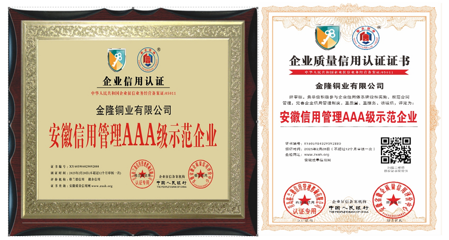 日前,金隆銅業有限公司被安徽省徽企質量信用評價中心授予“安徽質量信用AAA級示范企業”榮譽稱號。